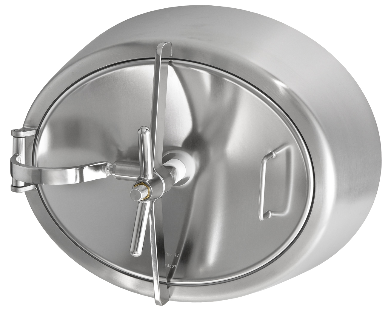 This model uses an electropolished lid and a satin-finished frame for a high-quality look. Overall, it meets PED guidelines for temperatures up to 100°C. It is the perfect fit for 588×492 mm tank openings.